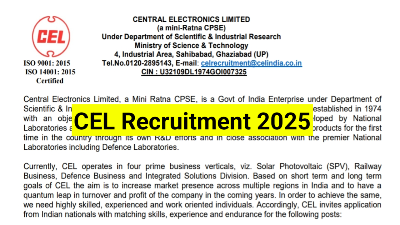 CEL Recruitment 2025 | Technician, Diploma Engineer, Operator, Clerk and Driver | 46 Posts | Last Date: 25th September 2025 |